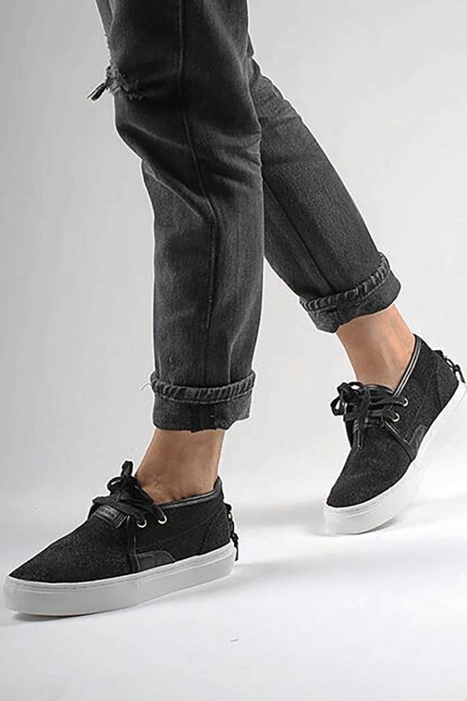 SLIP-ON/MID-TOP TRANSFROMS FROM A SLIP-ON TO A MODERN LACE UP MID BLACK STING RAY PIG SUEDE UPPER METAL D-RING WITH REMOVABLE LACE TIES MULTIFUNCTIONAL SIDE METAL EYELETS ULTRA SOFT CUPSOLE