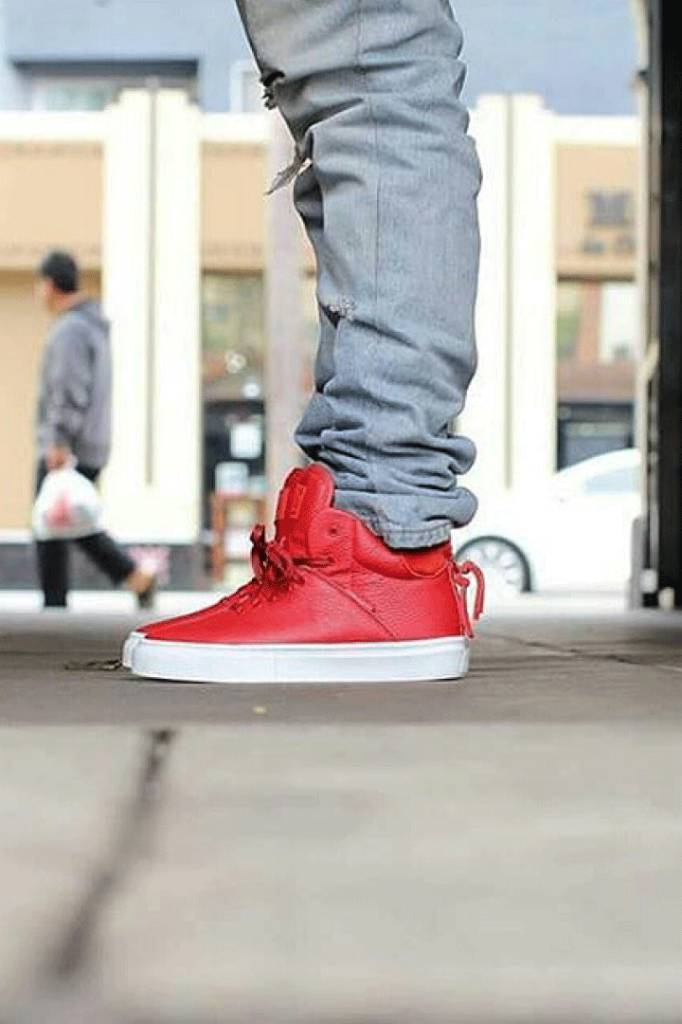 HIGH-TOP RED FULL-GRAIN LEATHER UPPER PIG SUEDE TONGUE AND HEEL DETAILS METAL D-RING WITH PIG SUEDE TASSELS ULTRA SOFT CUPSOLE