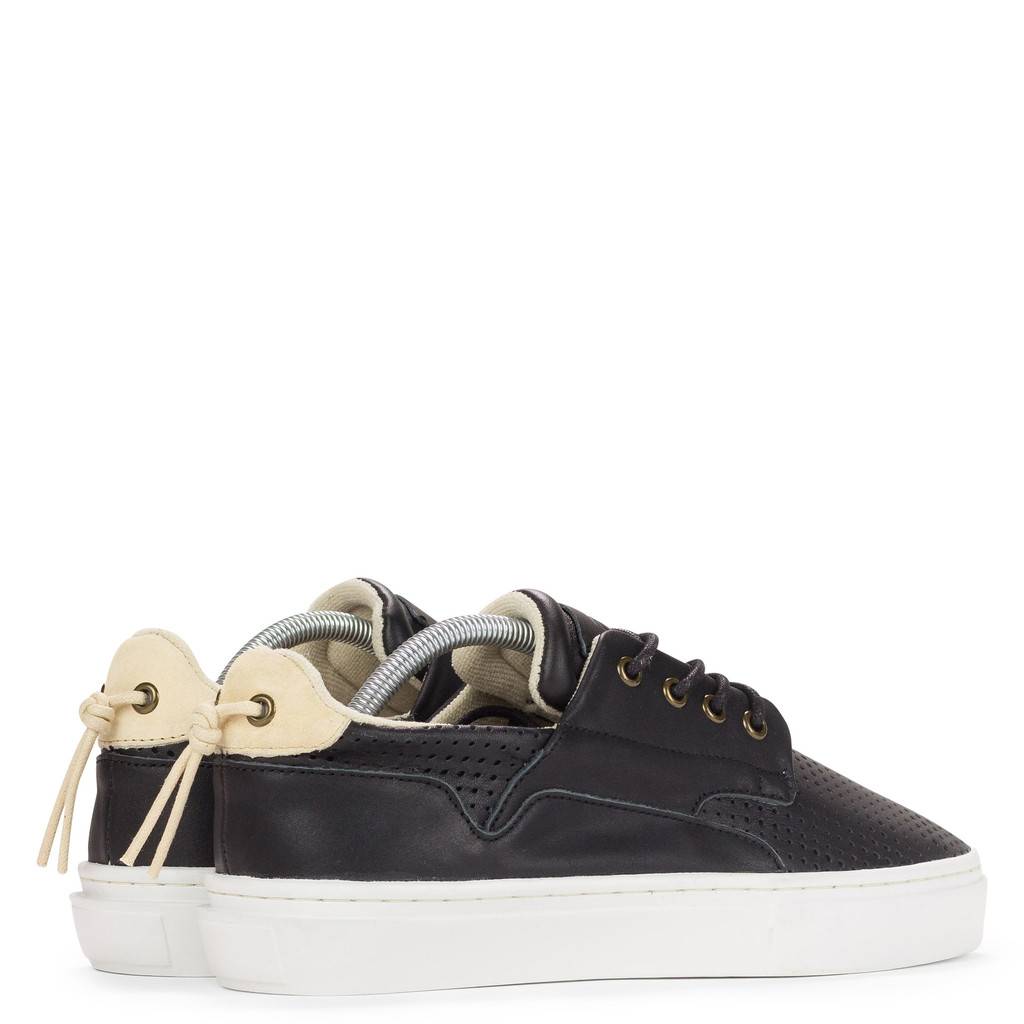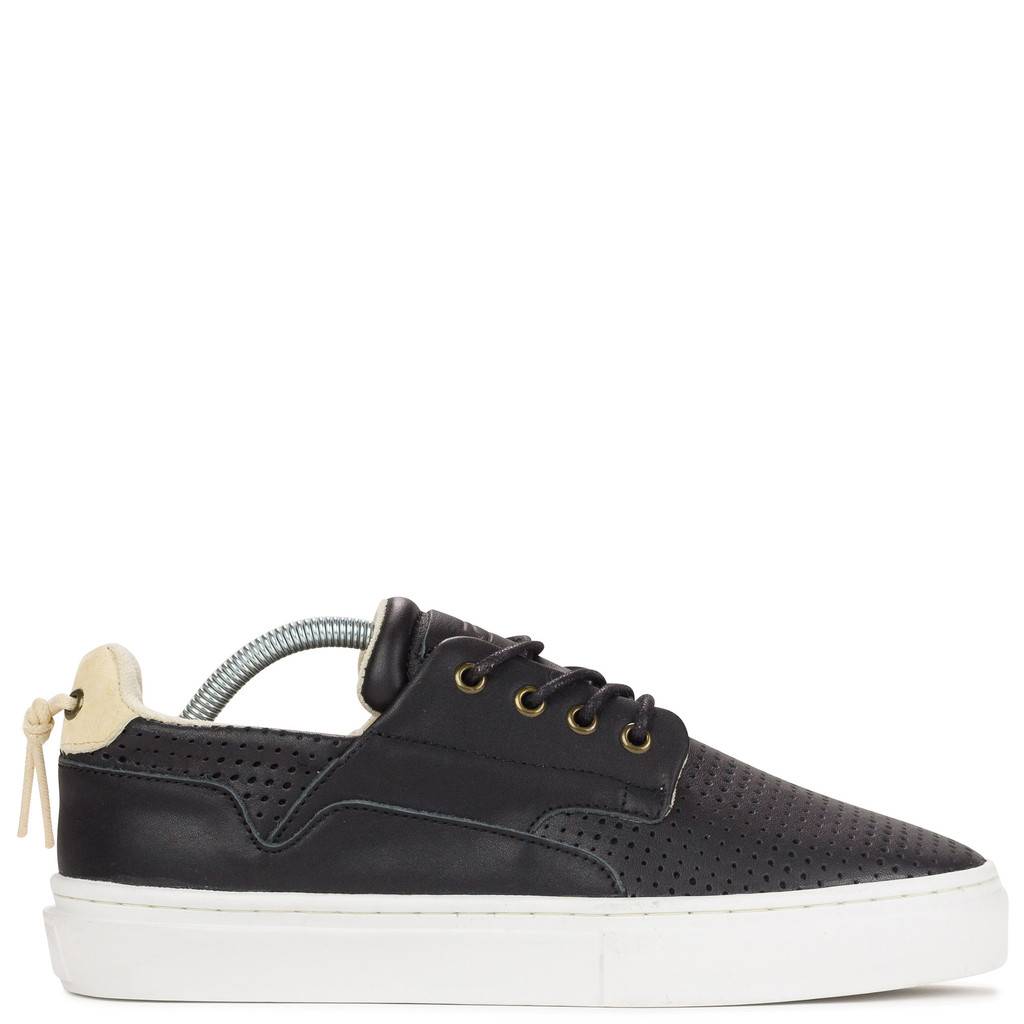 LOW TOP BOAT INSPIRED SNEAKER / BLACK FULLGRAIN LEATHER /GRADIENT PERFORATION / NAVAJO LEATHER HEEL TAB ANTIQUE BRASS EYELETS / ROPE LACES WITH A REAR LACE DETAIL /ULTRA SOFT CUPSOLE